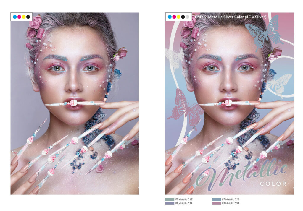 Silver and gold toners are not limited to metallic highlights alone. Combining silver and gold toners with CMYK also extends the range of colours that can be printed, making it possible to create a large number of metallic shades, offering unprecedented scope for creativity and new high profitable services to offer to your customers